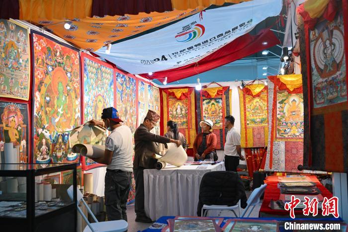图为拉萨进口商品展览会现场,顾客在选购唐卡。中新社记者 贡嘎来松 摄