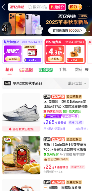 广大消费者只需打开拼多多百亿补贴,点击进入苹果新品专属页面,选择想要购买的新品,在平台补贴价的基础上准点领取“商品无门槛券”,至高可再减700元。此外,消费者还可在百亿补贴频道右上角点击进入“积分”活动页,在“限时抢券活动”专区,使用积分兑换“iPhone 17系列新品积分优惠券”,至多可再兑换100元,累计直降1000元。