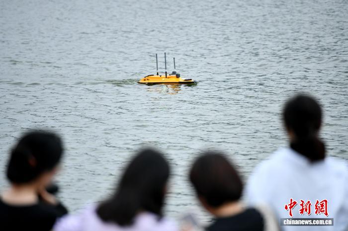 由技术人员操控的无人船,在湖中采集相关数据信息。沙见龙 摄