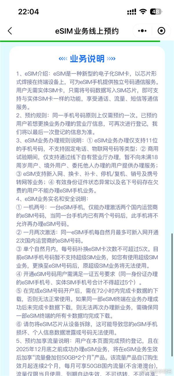 根据运营商公布的业务规则,eSIM使用存在一定限制,核心是平衡便利性与安全性。一台手机最多激活两个国内eSIM号码,实现了“无卡式双卡双待”。用户需满足“一证五号”要求,即同一身份证下的eSIM和实体SIM卡总数不超过5个。eSIM支持新入网、换卡、携号转网等业务,但目前仅支持11位手机号码,不支持固话、特服号等。用户需本人携带身份证和手机到线下营业厅办理,暂不支持未成年人、境外用户和代办。安全方面,运营商设置了72小时内完成卡数据下载的时限,超时未完成将影响后续业务办理。每台设备每月最多新开通2次eSIM号码,单个号码每月补换卡次数不超过5次。