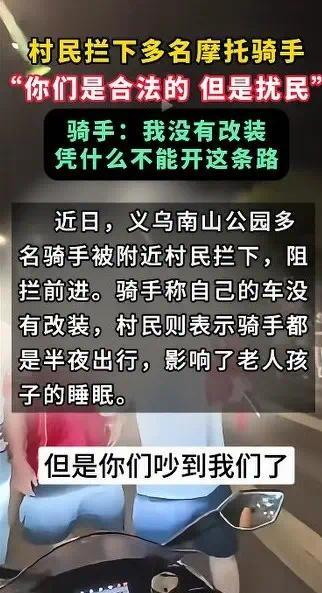 视频中的事情发生在浙江义乌南山公园,从网传的视频画面可以清晰的看到,多名摩托车骑手被村民拦了下来。