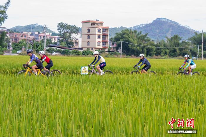 10月26日,广西梧州市龙圩区龙圩镇念村,骑行爱好者们穿梭于金黄的稻田小径,乐享深秋“丰”景。何华文 摄