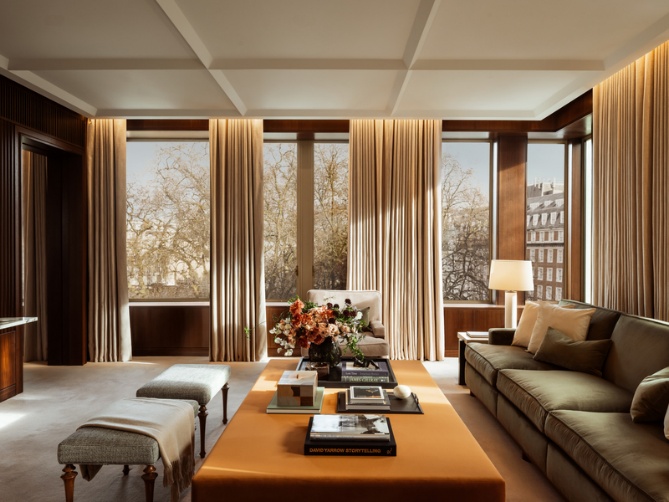 伦敦梅费尔瑰丽酒店配置 144 间精心设计的套房,室内设计由法国建筑师 Joseph Dirand 担纲。这位提倡极简主义风格的建筑师以酒店原始的、棱角分明的外观为底,辅以纯粹且优雅的设计笔触,呈现出现代风格与奢华质感相得益彰的内部空间。在氛围营造上,设计师采用温暖丰富的色调,并融入精致的装饰艺术风格细节、胡桃木镶板以及大理石和黄铜装饰,营造出传统英式绅士俱乐部的氛围。