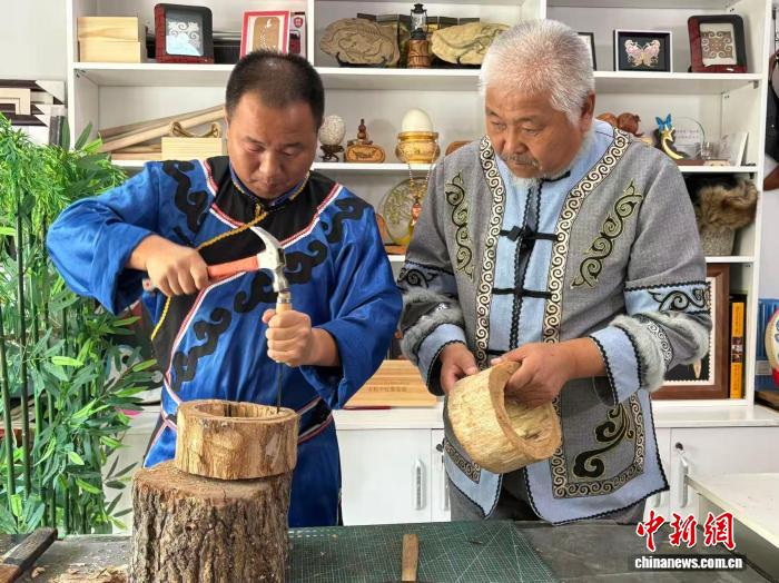 尤军指导儿子制作赫哲族乐器。 刘璐 摄