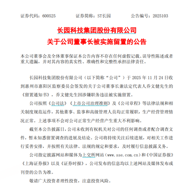 11月24日深夜,ST长园公告称,公司当天收到惠州市惠阳区监察委员会签发的关于公司董事长兼法定代表人乔文健的《留置通知书》,乔文健因涉嫌职务违法被实施留置。