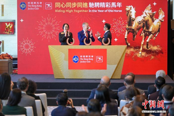 图为香港赛马会行政总裁应家柏(中)、“马年大使”郭富城(右)出席记者会。中新网记者 陈永诺 摄
