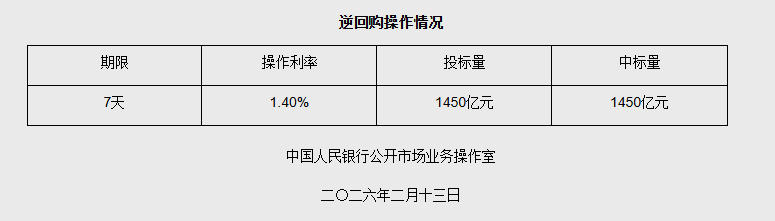 中新网2月13日电 据央行网站消息,2026年2月13日中国人民银行以固定利率、数量招标方式开展了1450亿元7天期逆回购操作。具体情况如下: