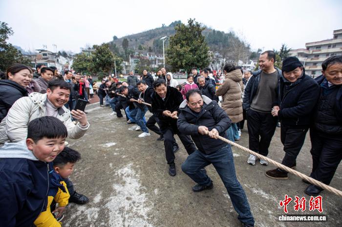图为2月12日,贵州省黔西市定新彝族苗族乡迎春活动现场,村民参与拔河比赛。史开心 摄