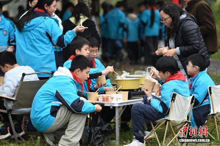 3月20日,重庆两江新区回兴小学开展校园户外野炊活动。在家长配合下,学生们来到校园空地体验户外烫火锅、烧烤,伴着春日烟火气亲近自然、放松身心,感受别样的趣味校园生活。图为学生在户外野炊。中新社记者 陈超 摄