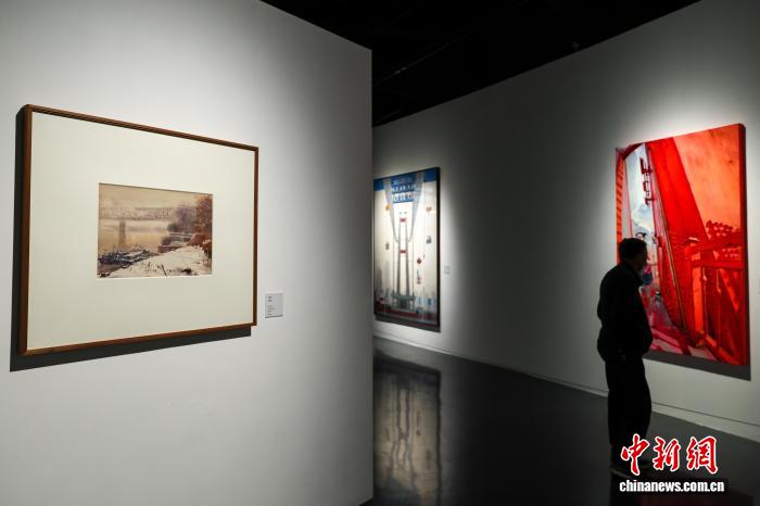 4月1日,湖北武汉,观众参观展出的油画作品《长江大桥》。 中新社记者 张畅 摄