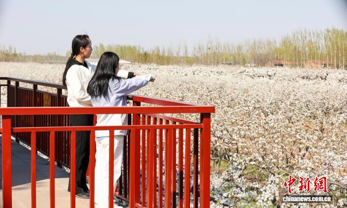 仲春时节,全国“十大最美农村路”——大运河堤顶路河北沧州段焕新姿。这条绿色“廊道”以盎然春意串联起生态美景、文化传承与民生幸福,成为市民游客踏青、健身、游览的好去处。图为4月7日,大运河堤顶路沧州段,游人在梨园赏花。 董国池 摄