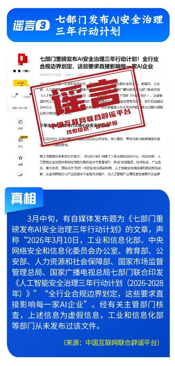 《七部门重磅发布AI安全治理三年行动计划》完全是自媒体凭空杜撰,工信部等部门公开表示并无相关文件。“科大讯飞向政府备案裁员30%”系网民为博关注而捏造。“农业银行”发送高额贷款短信实为营销号冒名发送,并非银行官方行为。“深圳将禁行电动自行车”是对管理措施征求意见稿的误读。“多地试点开征新能源汽车‘里程税’”则列举虚假试点地区与收费标准,已被多地税务部门明确予以否认。
