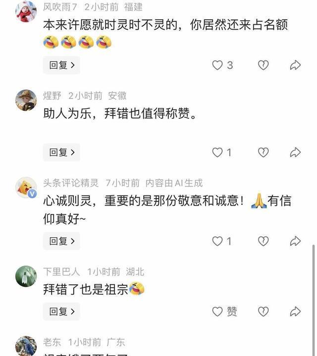 事情传开后,很多网友戏称心诚则灵,拜谁都不差。有人抱怨帮别人家的祖宗“加餐”两年了,也有人说拜错也没什么不好。甚至有评论认为许愿本来就是求得一份安心,你还来占个号?虽然气氛很轻松,但让人不禁想问为什么。