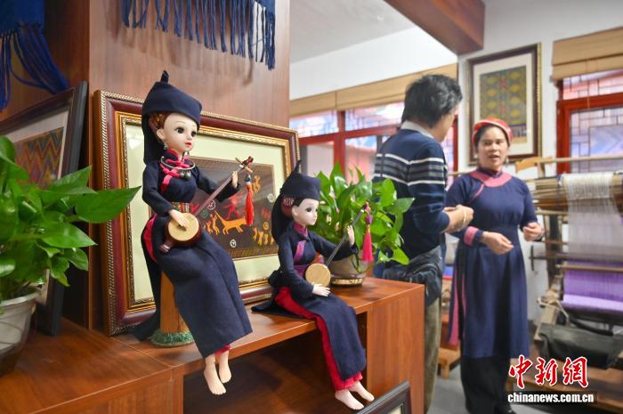 图为壮族娃娃。俞靖 摄 图为李素英创作含有壮、瑶、苗民族元素的织锦作品。俞靖 摄