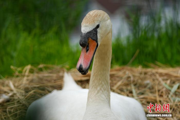 4月16日,河南郑州,随着气温回升,当地疣鼻天鹅进入孵化期。图为郑州金水河区域,疣鼻天鹅在巢中孵蛋。中新社记者 范晓恒 摄