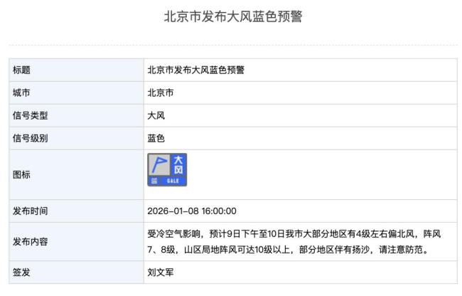 1月8日16时,北京市发布大风蓝色预警。受冷空气影响,预计9日下午至10日,北京市大部分地区将出现4级左右的偏北风,阵风可达7到8级,山区局地阵风甚至可能达到10级以上,部分地区伴有扬沙,请注意防范