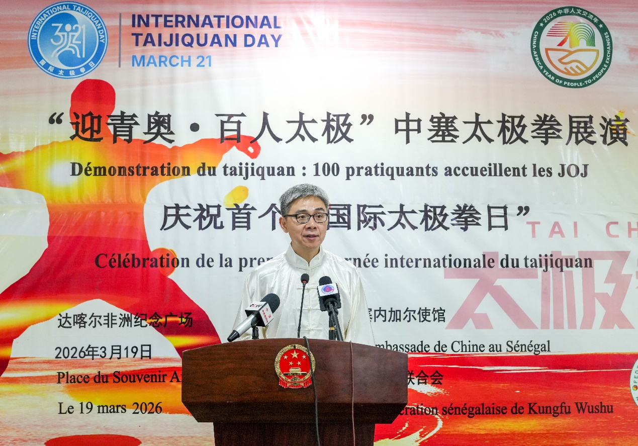 人民网约翰内斯堡3月20日电(记者戴楷然)达喀尔消息:3月19日由中国驻塞内加尔大使馆与塞内加尔武术联合会共同举办的“迎青奥·百人太极”中塞太极拳展演活动在位于达喀尔的非洲纪念广场成功举办。中国驻塞内