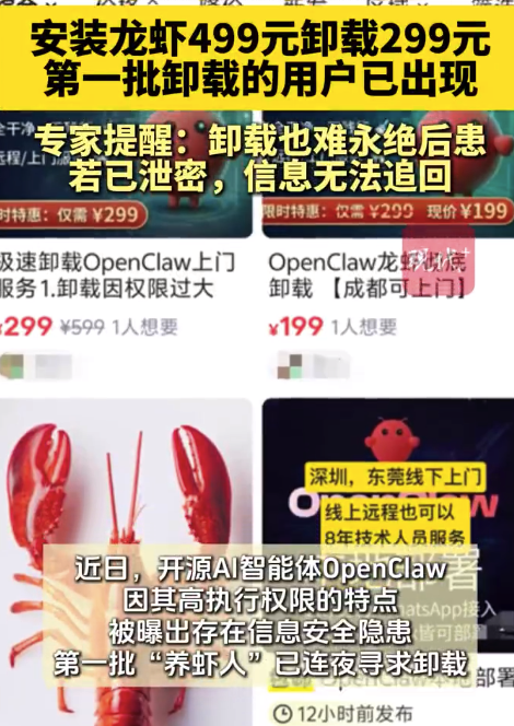 近日,开源AI智能体“小龙虾”OpenClaw持续火爆。因其高执行权限的特点,被曝出存在信息安全隐患。于是,“卸载龙虾”又成了AI新手的刚需,在电商平台上有人推出299元“上门卸载OpenClaw”的服务,号称可以“0残留”“永绝后患”,事...