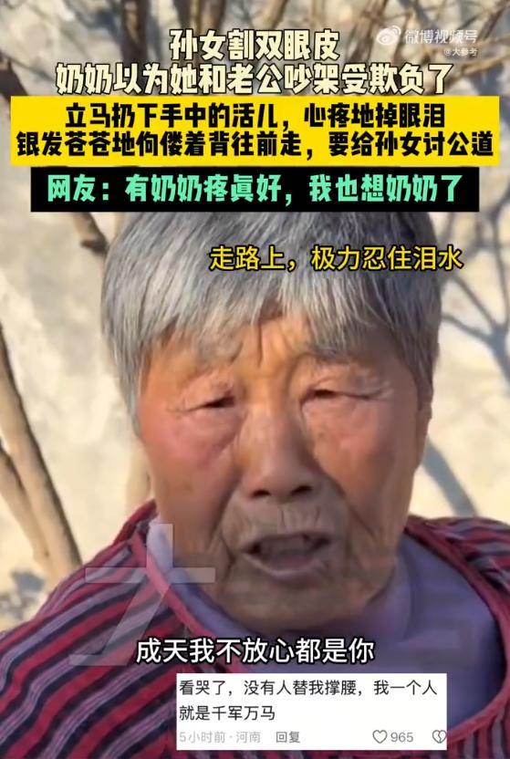 “你的眼咋肿了?谁打你了?”河南一女孩割双眼皮后回家,奶奶以为她和老公吵架受欺负了,立马扔下手中的活儿,心疼地掉眼泪,银发苍苍地她佝偻着背往前走,要给孙女讨公道。网友:有奶奶疼真好,我也想奶奶了