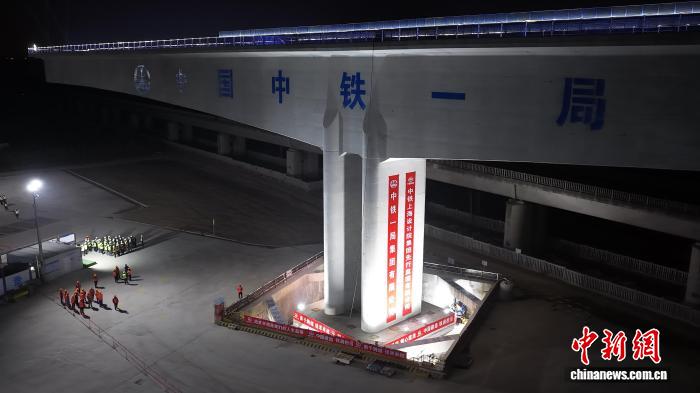 中新社安徽滁州1月16日电 (张强 陈卓然)16日,新建上海至南京至合肥高速铁路(简称沪宁合高铁)跨京沪高铁特大桥2×100米预应力混凝土单T构梁成功转体,梁体总重1.7万吨。