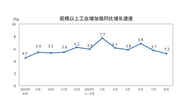 中新网9月15日电 据国家统计局网站消息,8月份,规模以上工业增加值同比实际增长5.2%(增加值增速均为扣除价格因素的实际增长率)。从环比看,8月份,规模以上工业增加值比上月增长0.37%。1—8月份,规模以上工业增加值