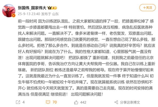 9月13日晚,中国男子跳高运动员、千万粉丝网红张国伟在社交平台发文,谈及自己近期遭遇的困境。他表示,前段时间因受伤导致膝盖和跟腱相继出现问题。之前摔了一跤,膝盖受伤严重,感觉每跑一步都可能脱臼,特别害怕