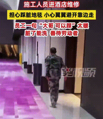 云南一家酒店内,一位装修工大叔进去维修,看见路中央的地毯干干净净,他担心会被自己踩脏,于是小心翼翼地贴着边缘走路,这时一位员工发现后,直接说了一句“大哥,可以踩”,大叔这才放心地踩在地毯上走路,对此这位员工表示,地毯本来就是用来踩的,不可以...