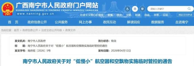 4月12日,南宁市人民政府门户网站发布关于对“低慢小”航空器和空飘物实施临时管控的通告,4月15日起主城区全域禁飞4天。详情如下:南宁市人民政府门户网站截图为维护南宁市公共安全和社会秩序,根据《中华人民共和国民用航空法》《中华人民共和国刑法...