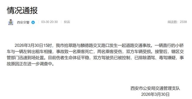 2026年3月30日15时,西安市拾翠路与麟德路交叉路口发生一起道路交通事故。一辆直行的小轿车与一辆左转出租车相撞,事故导致一名乘客死亡,两名乘客受伤,双方车辆受损。接警后,辖区交管部门迅速到场处置