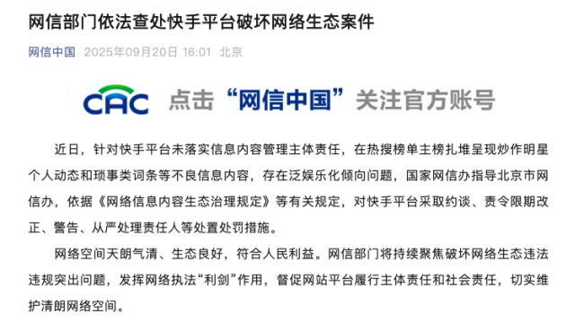 近日,针对快手平台未落实信息内容管理主体责任,在热搜榜单主榜扎堆呈现炒作明星个人动态和琐事类词条等不良信息内容,存在泛娱乐化倾向问题,国家网信办指导北京市网信办