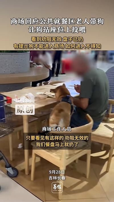 商场公共就餐区老人带狗上桌。近日,吉林长春一商场,一位老人带着狗在公共就餐区域上桌。对此,商场工作人员回应称,只要看到这种情况就会劝阻,劝阻无效会将相关餐盘扔掉,有提示贴提醒大家不允许带狗进入,但什么素质的顾客都有,并且该区域约有2000多...